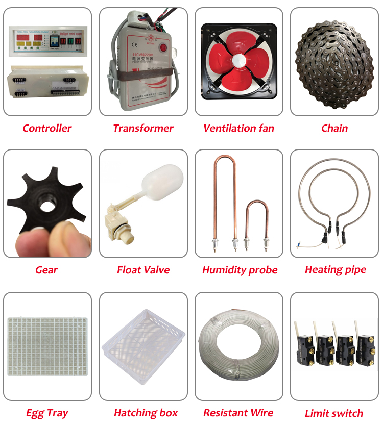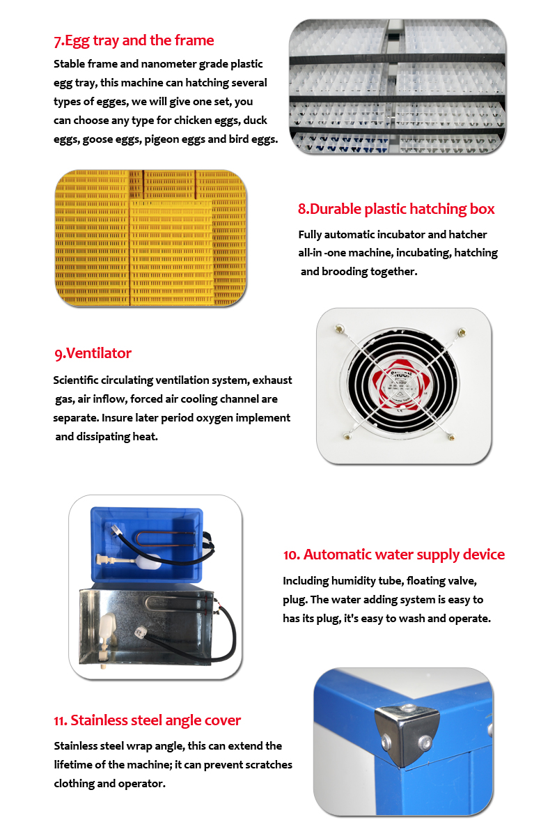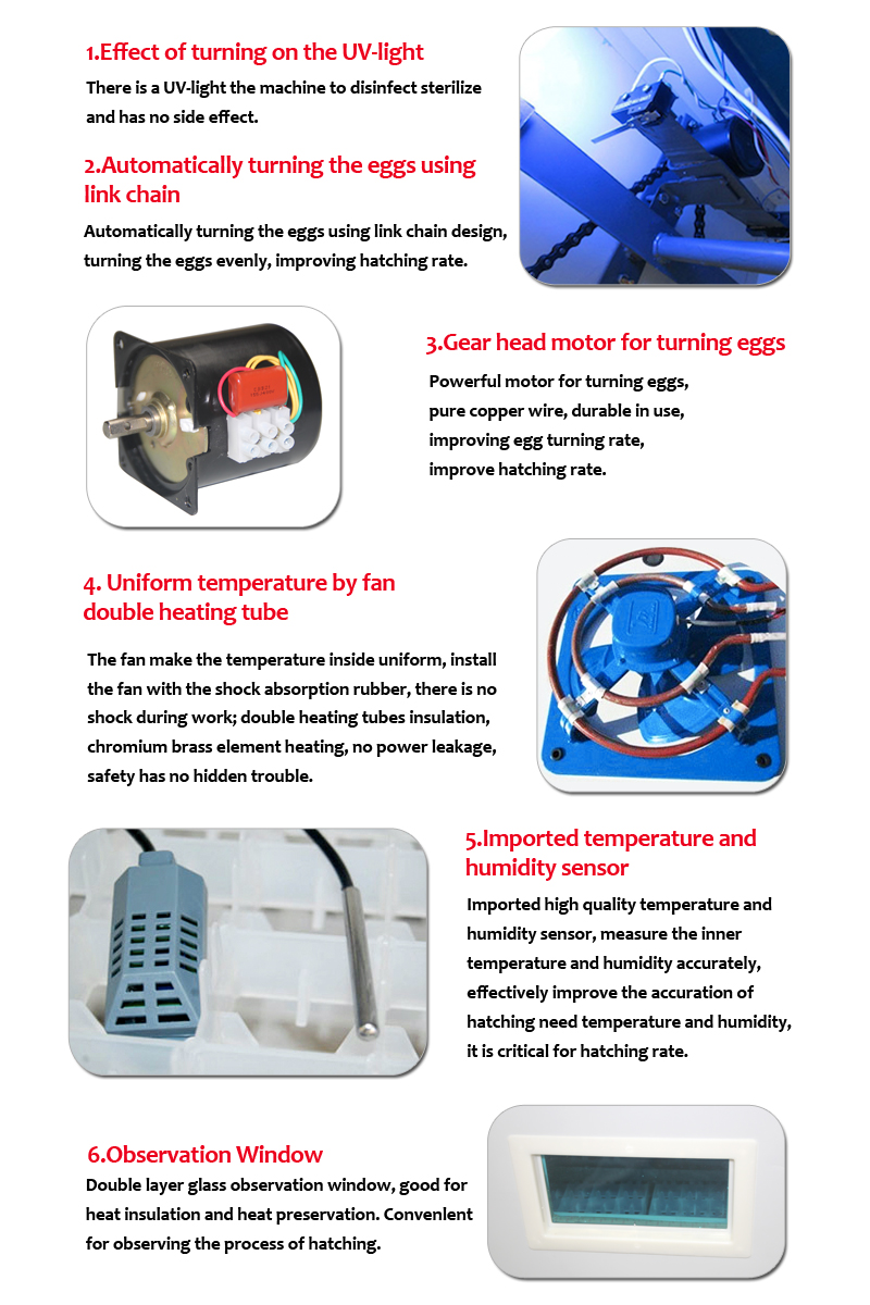 1. Fully automatic (temperature, humidity, water heater, egg turning, circulation).