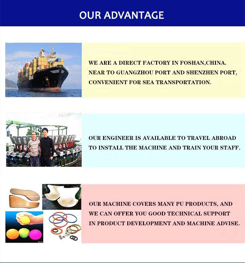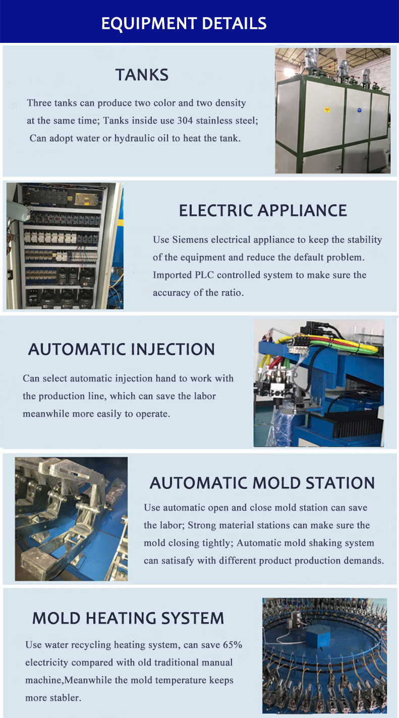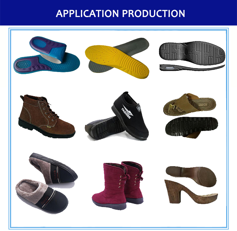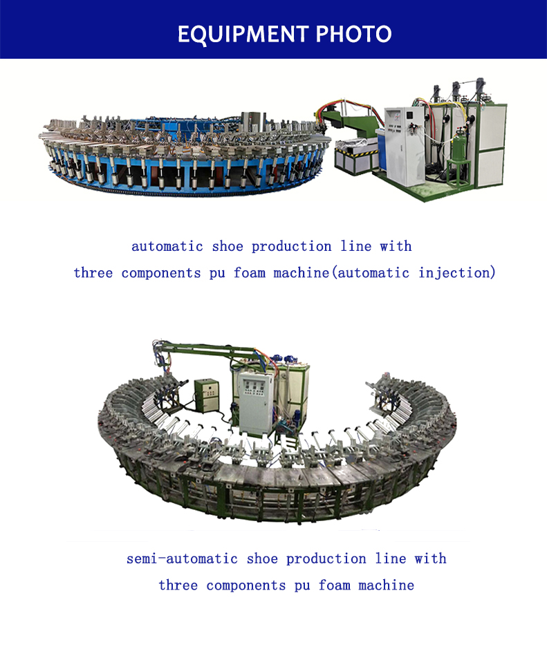 The equipment is used to produce polyurethane insoles, outsole, high heels, leather shoes, casual shoes, safety shoes, travel shoes, slippers, sandals, flip-flops and other polyurethane shoes.