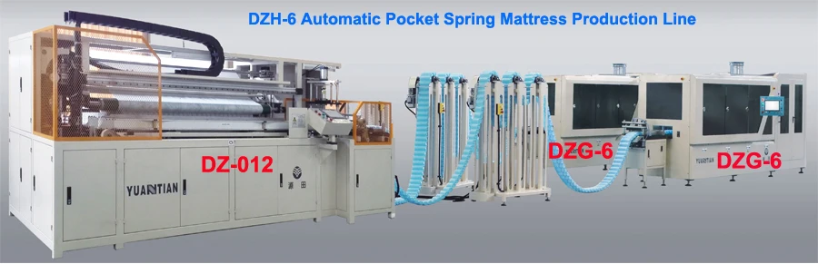 DZH-6 is an automatic production line machine for pocket spring unit with 2 set of DZG-6 coiling machine, and 1 set of assembling machine DX-012 which is with microcomputer NC, self-developed control system,devices for connecting, conveying and glue spraying. It’s the best choice for the production of pocket spring unit production.