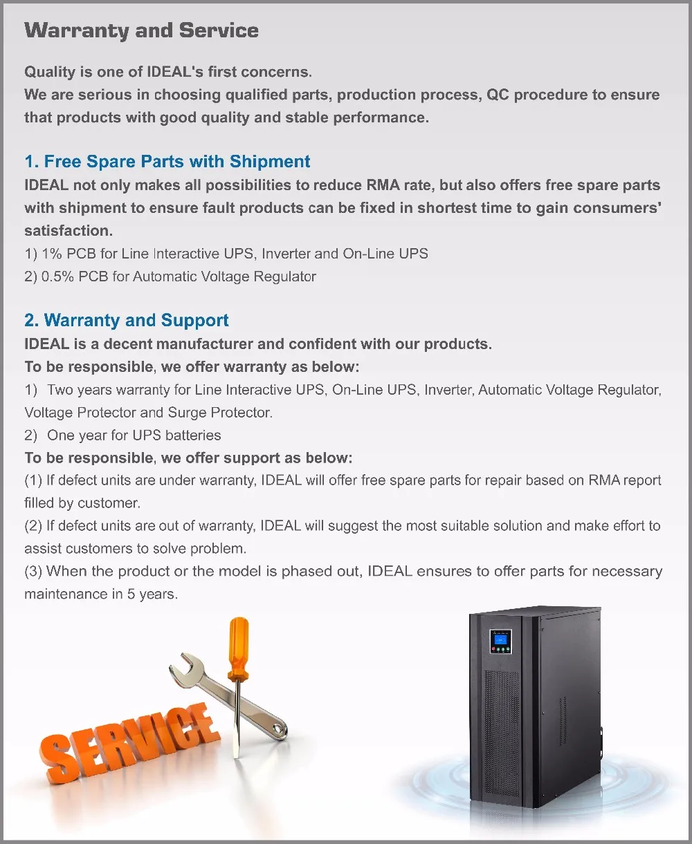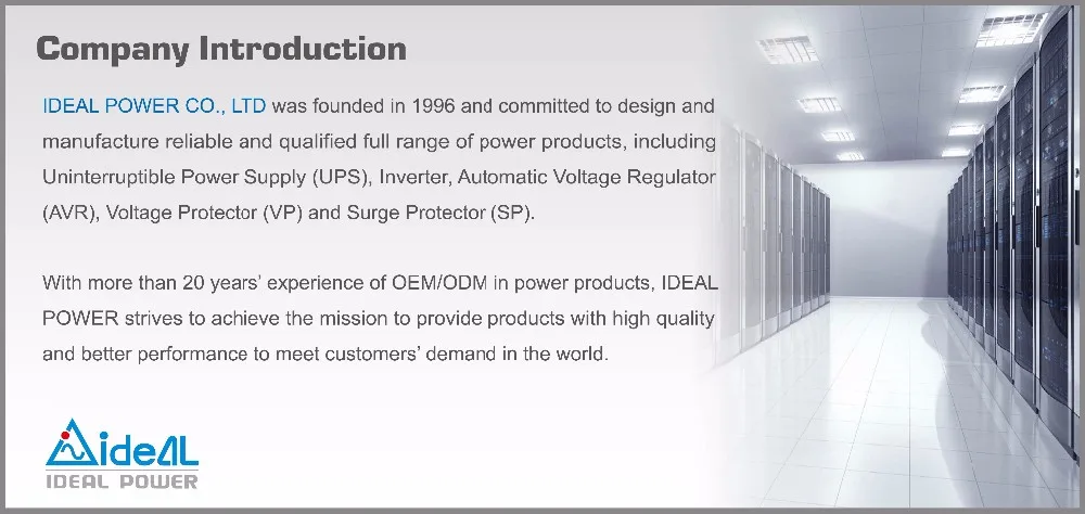 IDEAL POWER CO., LTD was founded in 1996 and committed to design and manufacture reliable and qualified full range of power products, including Uninterruptible Power Supply (UPS), Inverter, Automatic Voltage Regulator (AVR), Voltage Protector (VP) and Surge Protector (SP).