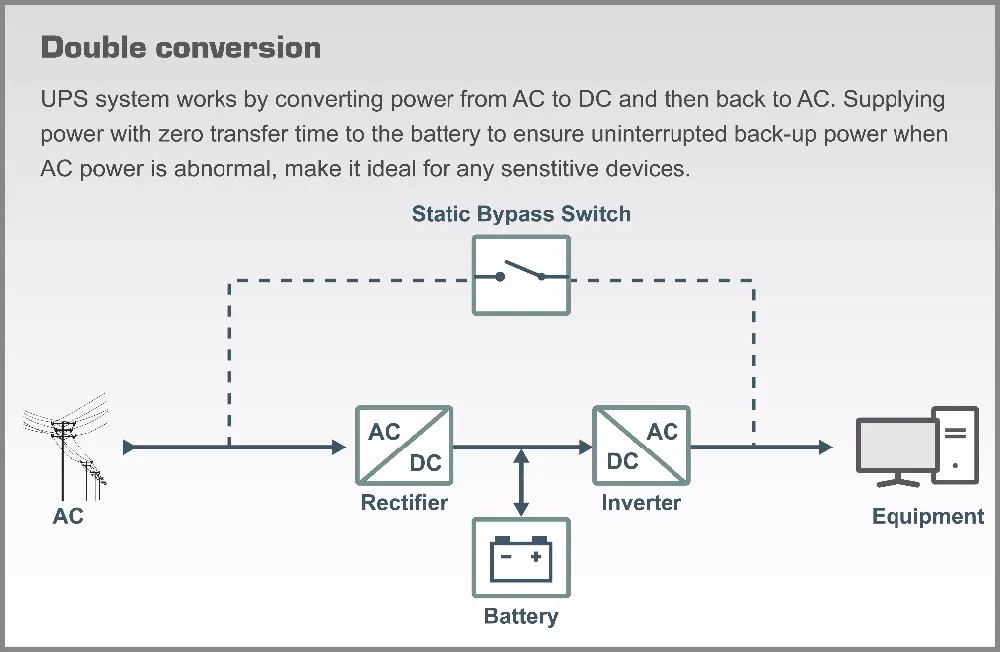 UPS system works by converting power from AC to DC and then back to AC. Supplying power with zero transfer time to the battery to ensure uninterrupted back-up power when AC power is abnormal, make it ideal for any senstitive devices. online ups 6kva o