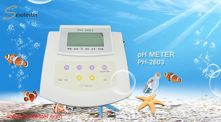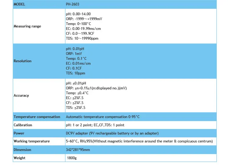 | PH-2603 | pH | 0.00-14.00 pH | 0.01 pH | ±0.01 pH | ATC: 0-95℃ Working voltage: 9V Working condition: 5-50℃, RH<95% 1 or 2 points calibration | Bench top High accuracy Replaceable electrode With backlit Automatic temperature compensation With built-in rechargeable battery |