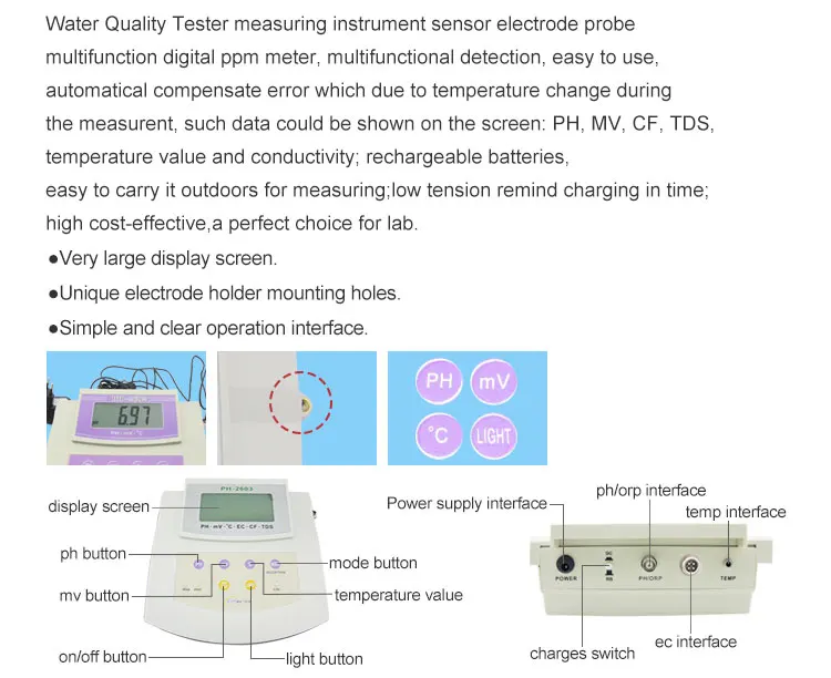 multifunction digital ppm meter, Multifunctional detection, easy to use, automatical compensate error which due to temperature change during the measurent, such data could be shown on the screen: PH, MV, CF, TDS, temperature value and conductivity; rechargeable batteries, easy to carry it outdoors for measuring;low tension remind charging in time;high cost-effective,a perfect choice for lab.