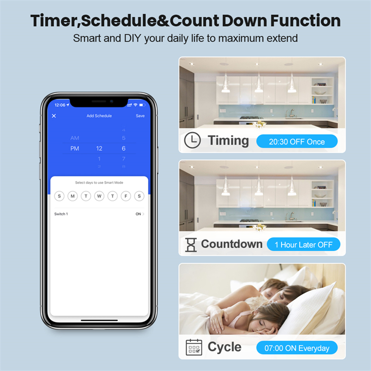 1. Hands-free voice control: Compatible with Amazon Alexa and Google Home for easy voice control. 2. Wi-Fi/4G Remote Control: Control your lights anytime, anywhere with the "Smart Life or Graffiti" app (iOS or Android). The app can be easily shared with multiple family members. 3. Schedule/Countdown: Use the schedule to set your switch to automatically turn on and off when you are at home or away. You can even use the Smart Settings feature to sync your lights to adjust for sunset and sunrise/weather/temperature and even air quality. The auto on/off function provides you with a countdown option of 1 minute/5 minutes/30 minutes/1 hour. |