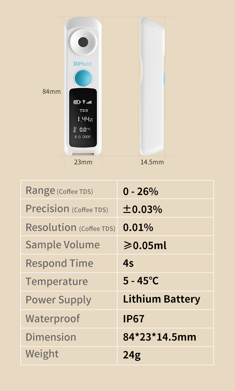| power supply: | 5V-350mAh | Test Range: | 0-26% Coffee TDS |