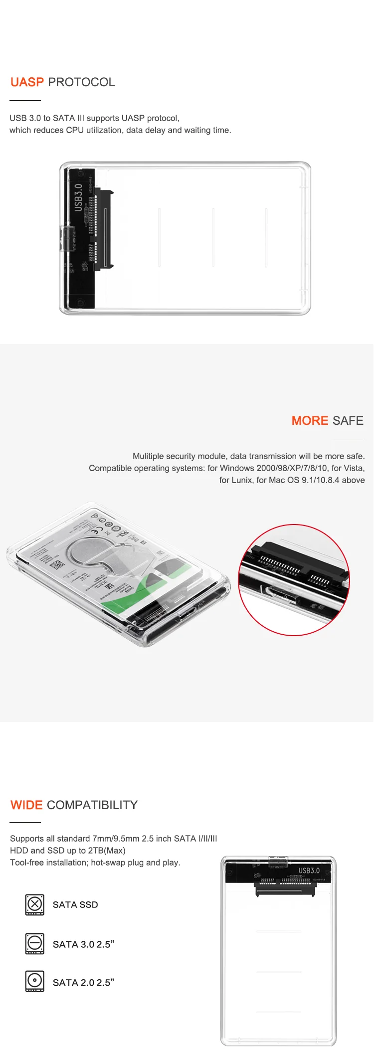 | Support | All standard 7mm/9.5mm 2.5 inch SATA I/II/III HDD and SSD up to 2TB |