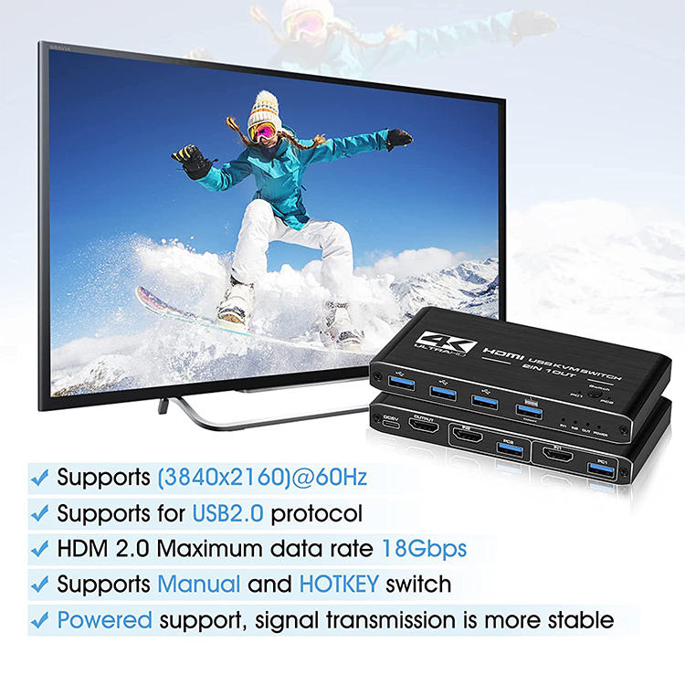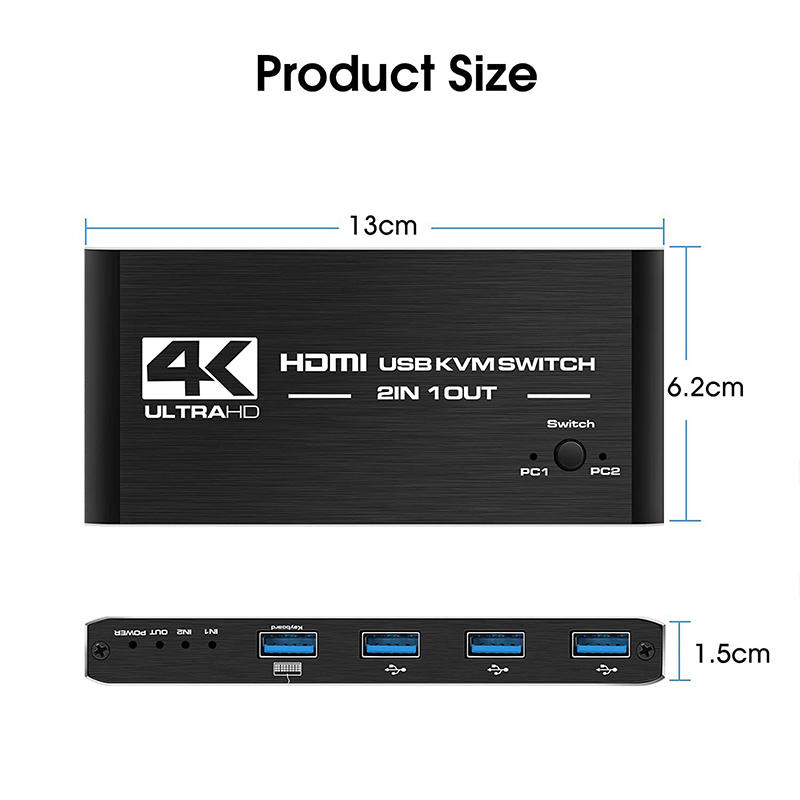 【4K@60Hz 2 Ports】USB KVM HDMI Switch Box 4K HDMI KVM Switch Box allows you to control two computers with just one control and display screen (mouse and keyboard). Built-in high-performance chip, using high-tech decoding, plug and play, no driver required. It will be ideal for businesses, offices, multimedia teaching, meeting rooms, game rooms, home theaters, research testing, and more. 【4K Ultra HD Resolution】NEWCARE HDMI KVM switch 2 ports support full 18 Gpbs bandwidth, support resolution up to 4K@60Hz, HDMI2.0b, HDCP2.2 YUV: 4:4:4 chroma sampling, make the displayed image More detailed and realistic to really feast your eyes. (Support 4k@60Hz high resolution, backward compatible with 4K@30Hz, 1080P and below devices.) 【Hotkey switch, plug and play】USB HDMI switch is designed with hotkey and button switch, which can be used between two computers Switch freely. USB switching power supply provides more stable signal transmission. Plug and play, save space. Supports wireless keyboards, mice and mechanical gaming keyboards. (Unlike USB power, HDMI power is easier to wake up the device when the computer is in sleep mode, more convenient and time-saving) 【Stable connection and wide compatibility】4K 2-port HDMI KVM switch, compatible with PC, Laptop, Apple TV, PS3/PS4/PS5, Xbox, Sony Blu-ray players, projectors, audio/video receivers and most HDMI enabled devices. High-speed transmission, no delay, no loss of picture and sound quality. (The HDMI switch supports wired/wireless keyboard and mouse and other USB devices can also be recognized) 【Package Contents】2 in 1 output HDMI USB KVM switch x 1, USB cable x 2, user manual x 1, DC 5V cable x 1 .