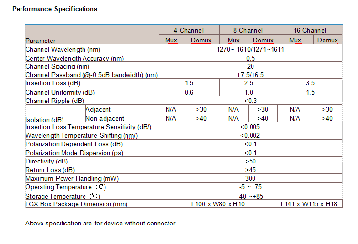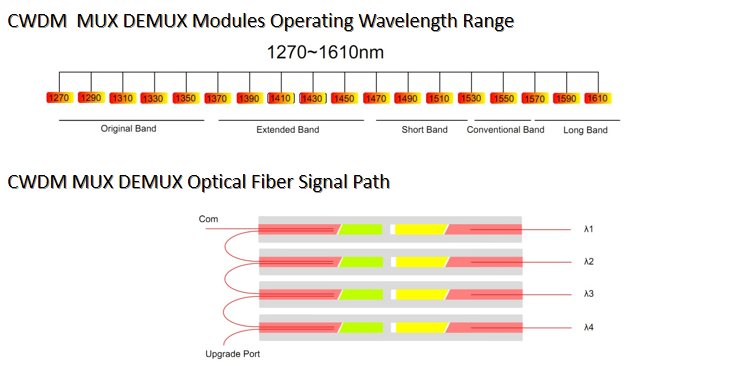 CWDM refers to Coarse Wavelength Division Multiplexer, CWDM MUX DEMUX modules transmit up to 18 different wavelengths on a single fiber with 20nm pitch in the ITU-T CWDM grid standard of 1270nm to 1610nm.