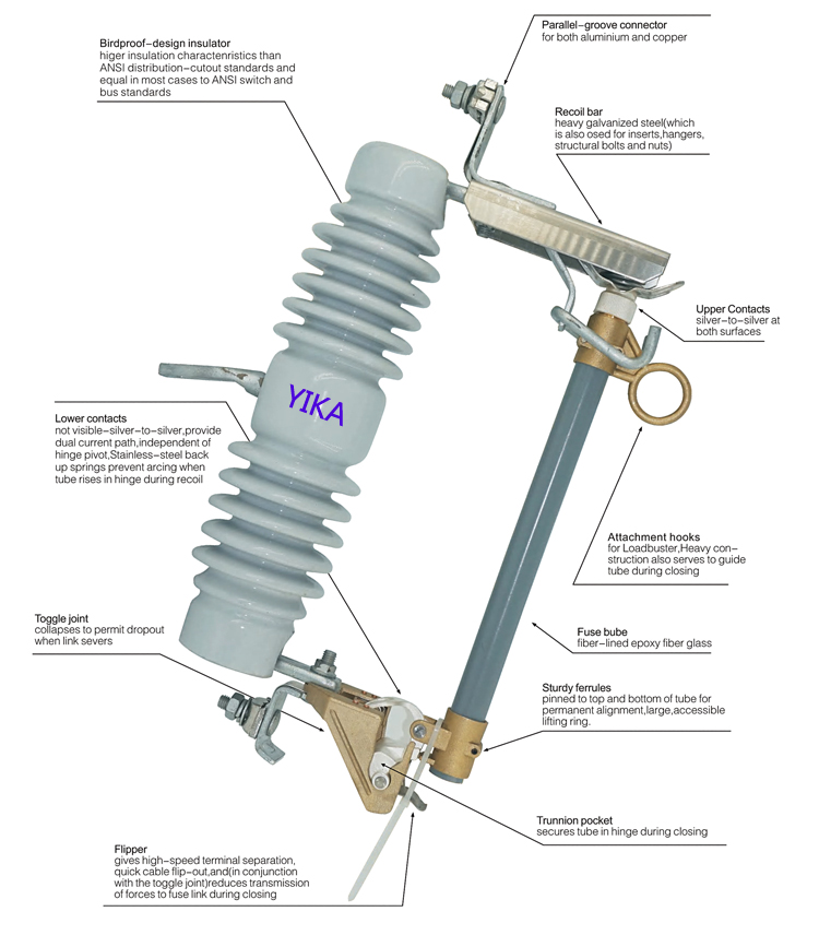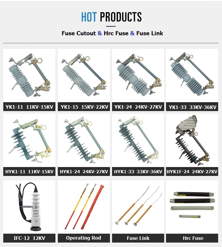 The fuse is connected to the incoming or distribution lines of the distribution transformer. These are mainly used to protect transformers or lines from short circuits, overloads and switching currents. The drop fuse is composed of an insulating bracket and a fuse tube. The static contacts are fixed on both sides of the insulating bracket, and the moving contacts are installed at both ends of the fuse tube. The inside of the fuse is a fire extinguishing tube, and the outside is a phenolic composite paper tube or epoxy glass.