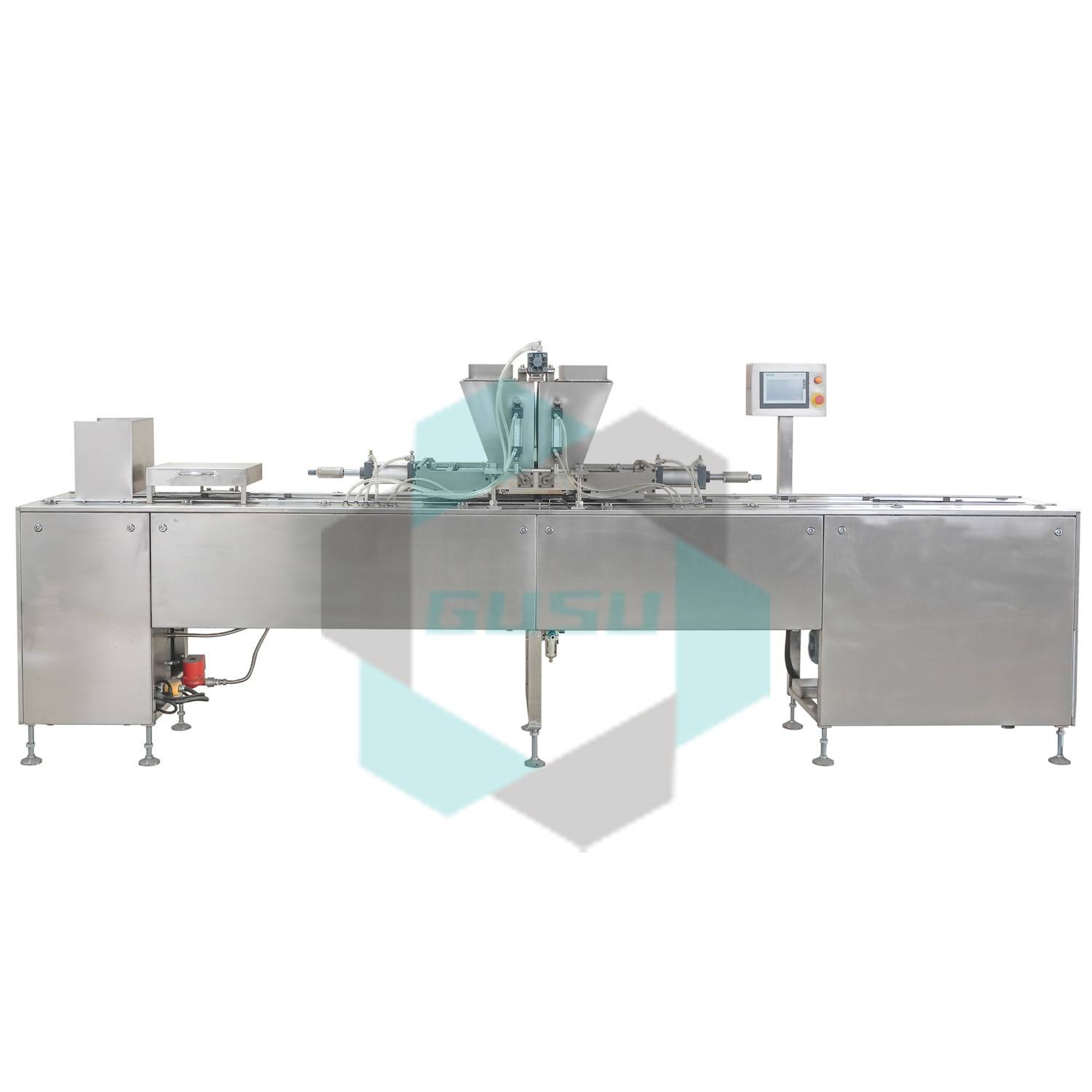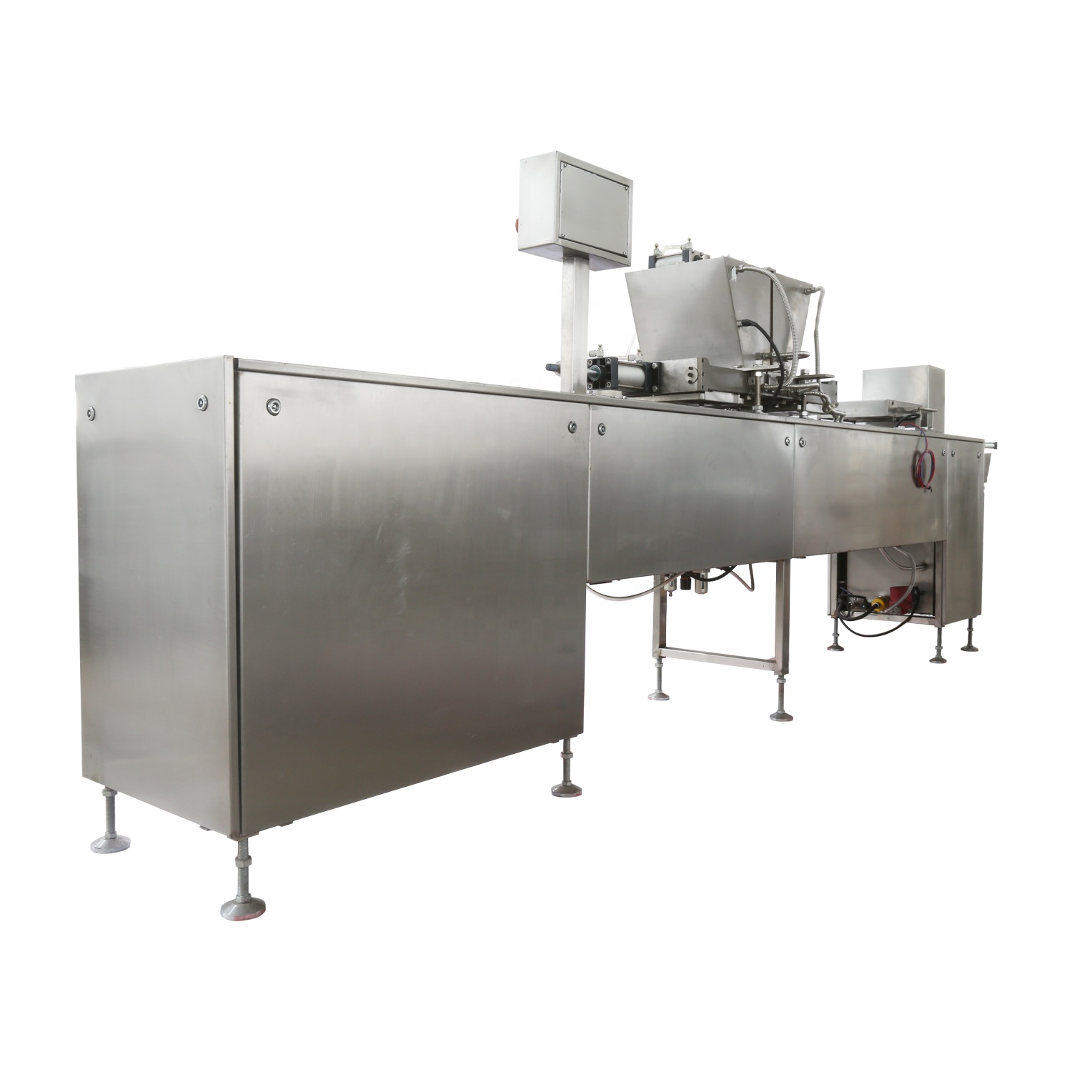The chocolate forming machine is an automatic chocolate forming machine with functions such as mould baking, mould pouring, mould vibration, conveying, cooling and demoulding. It not only produces pure solid chocolate, but also sandwich chocolate, nut mixed chocolate, etc.