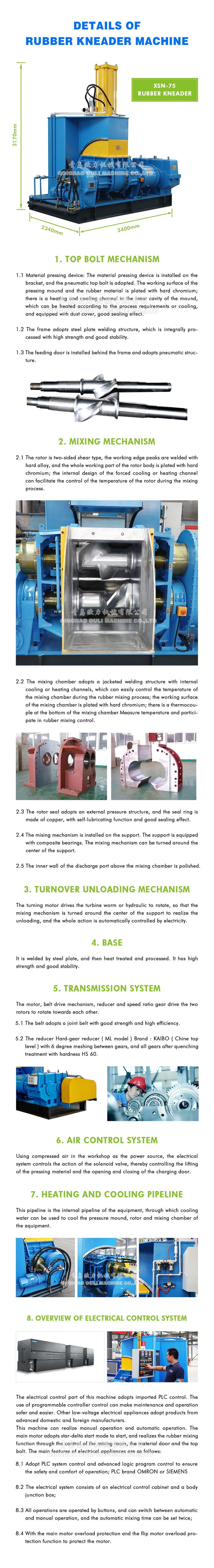 This machine can realize manual operation and automatic operation. The main motor is started by the star-delta starting method, and the rubber mixing function is realized through the control of the mixing chamber, the material door and the top bolt. The main features of the appliance are as follows: