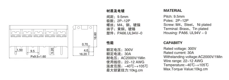 | Packaging Detail: | Box/bag; | Product name: | 9.5MM 300V/25A HB9500 4pin Barrier electric terminal block connector; |