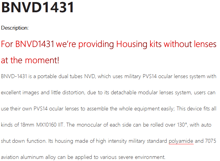 | Lens System: | PVS14 eyepiece | Operating Voltage: | 1.5-6v |