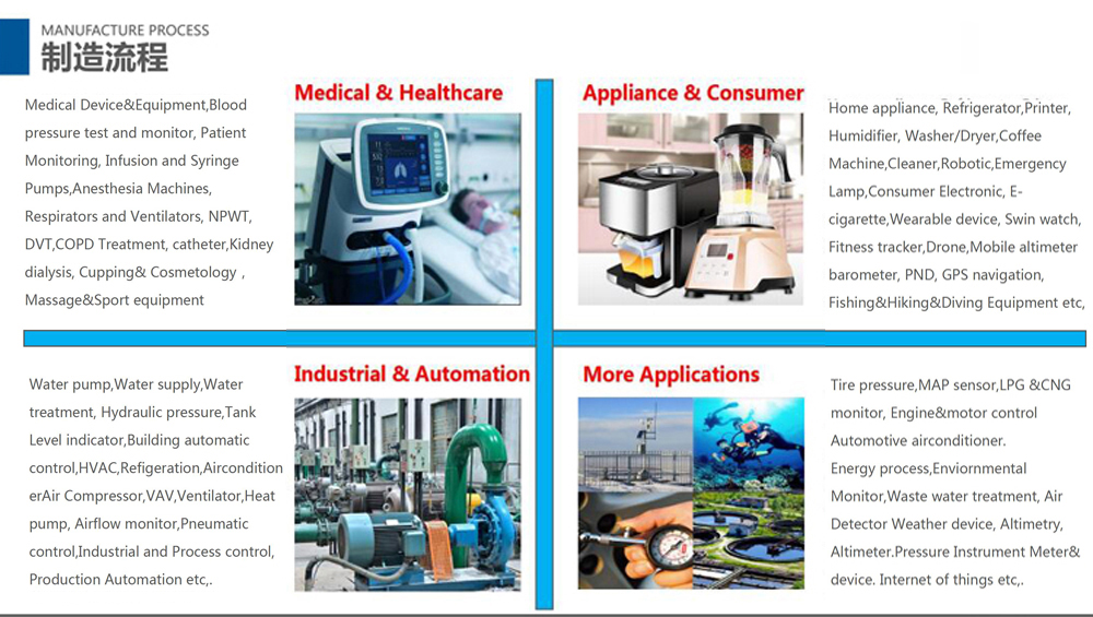 Used in the field of medical and health equipment such as blood pressure tests and monitors, patient monitors, infusion and syringe pumps, anesthesia machines, respirator and ventilators, NPWT, DVT, COPD therapy, catheters, kidney dialysis, cupping and cosmetology, massage equipment, etc.