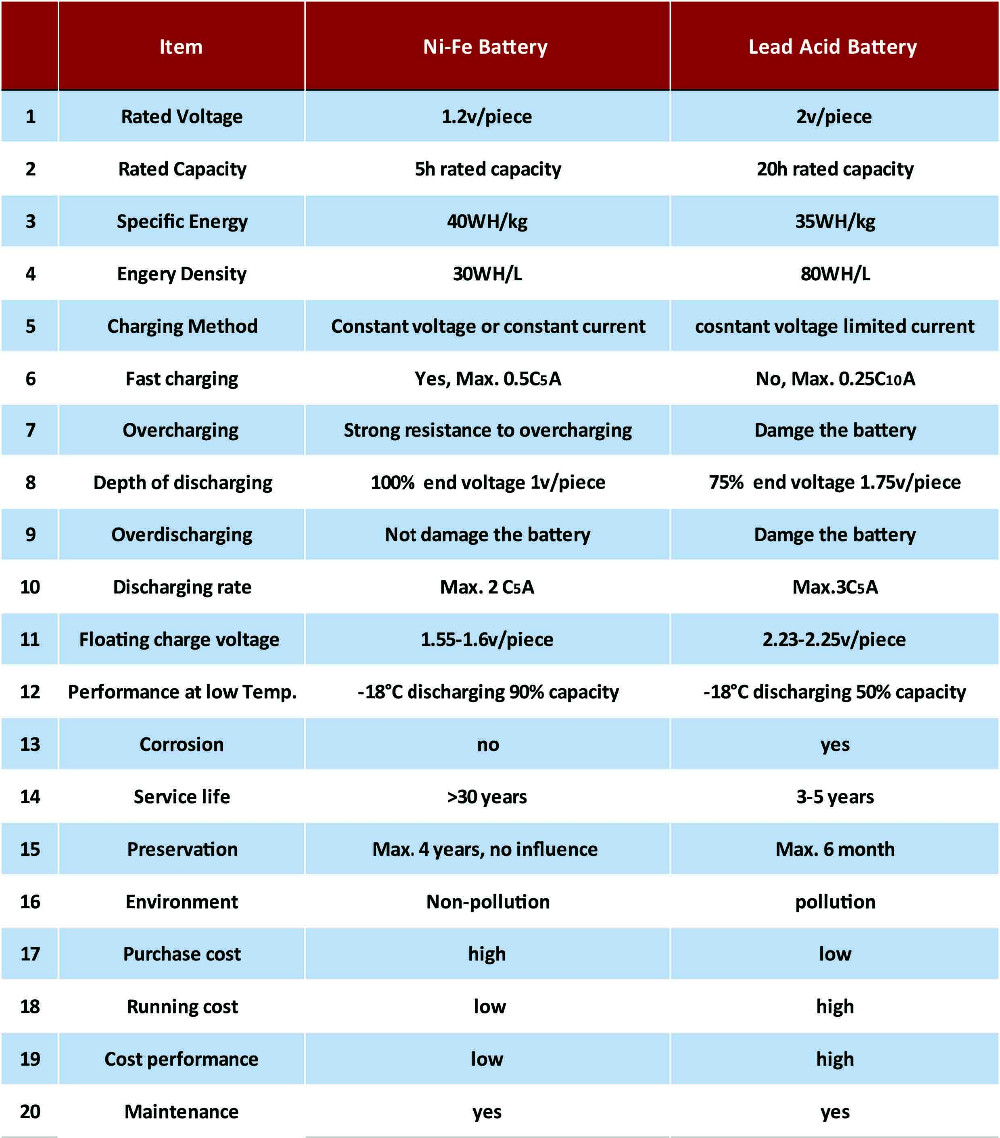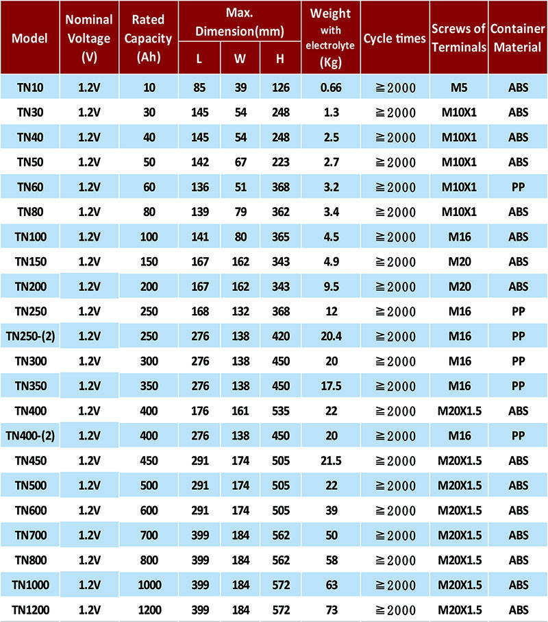 With the characteristics of long service life, 100% depth of discharge, and no pollution, nickel-iron batteries are becoming more and more popular in the photovoltaic market. TN series nickel-iron batteries produced by the companyHenan Xintaihang Power Co., Ltd. is designed with advanced technology. they have strongWelded sheet structure, ABS material container and special Flame Retardant Valve Regulated Air Plug. The rich electrolyte ensures a long maintenance period.