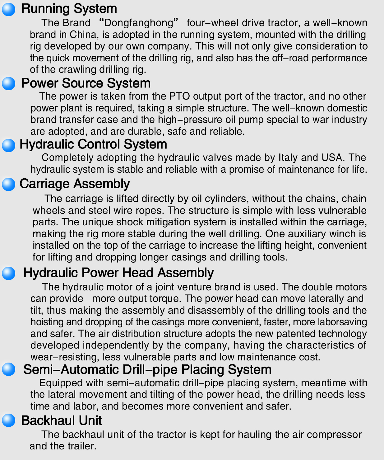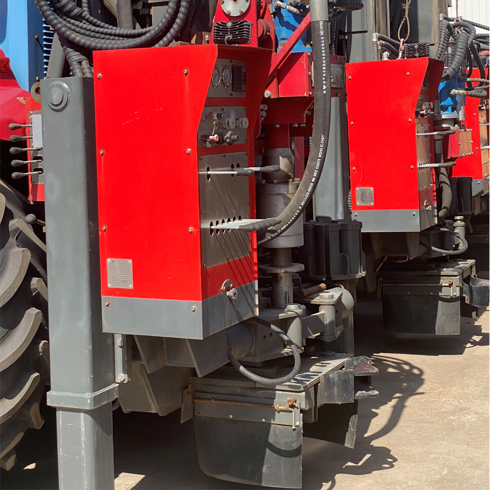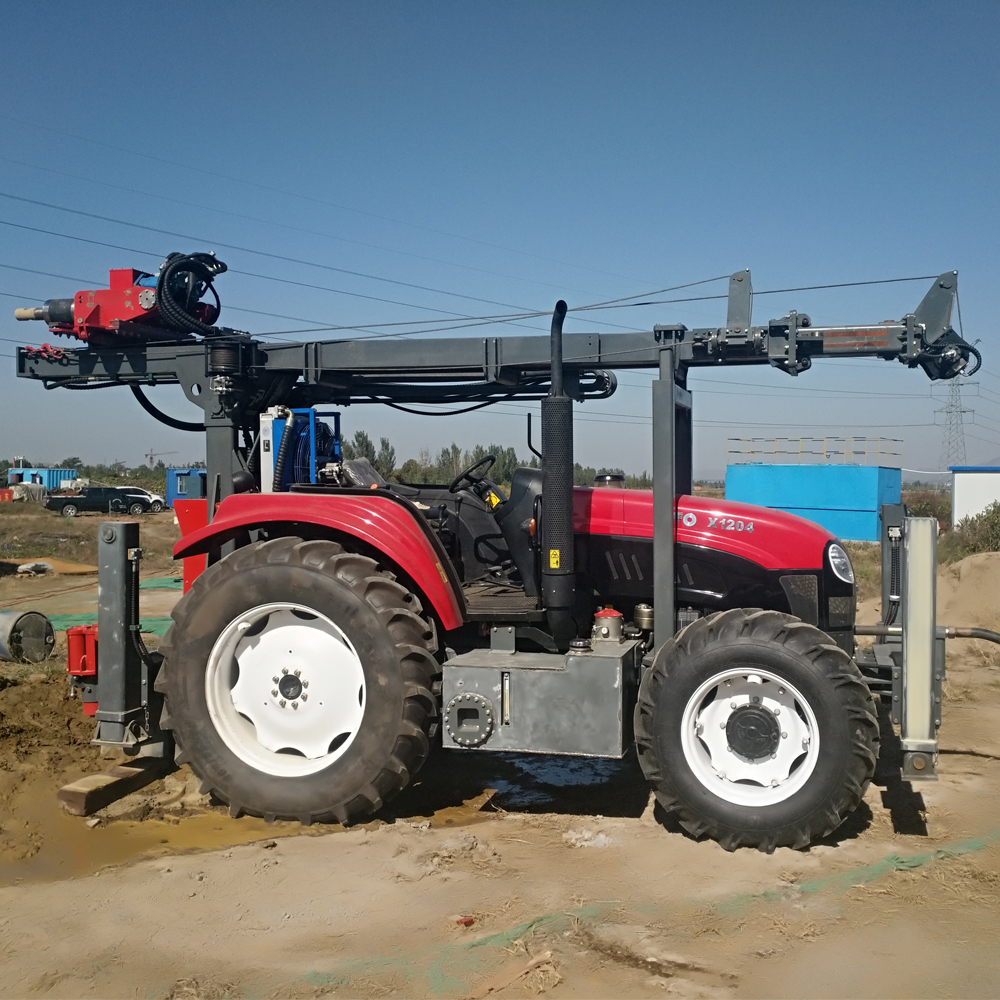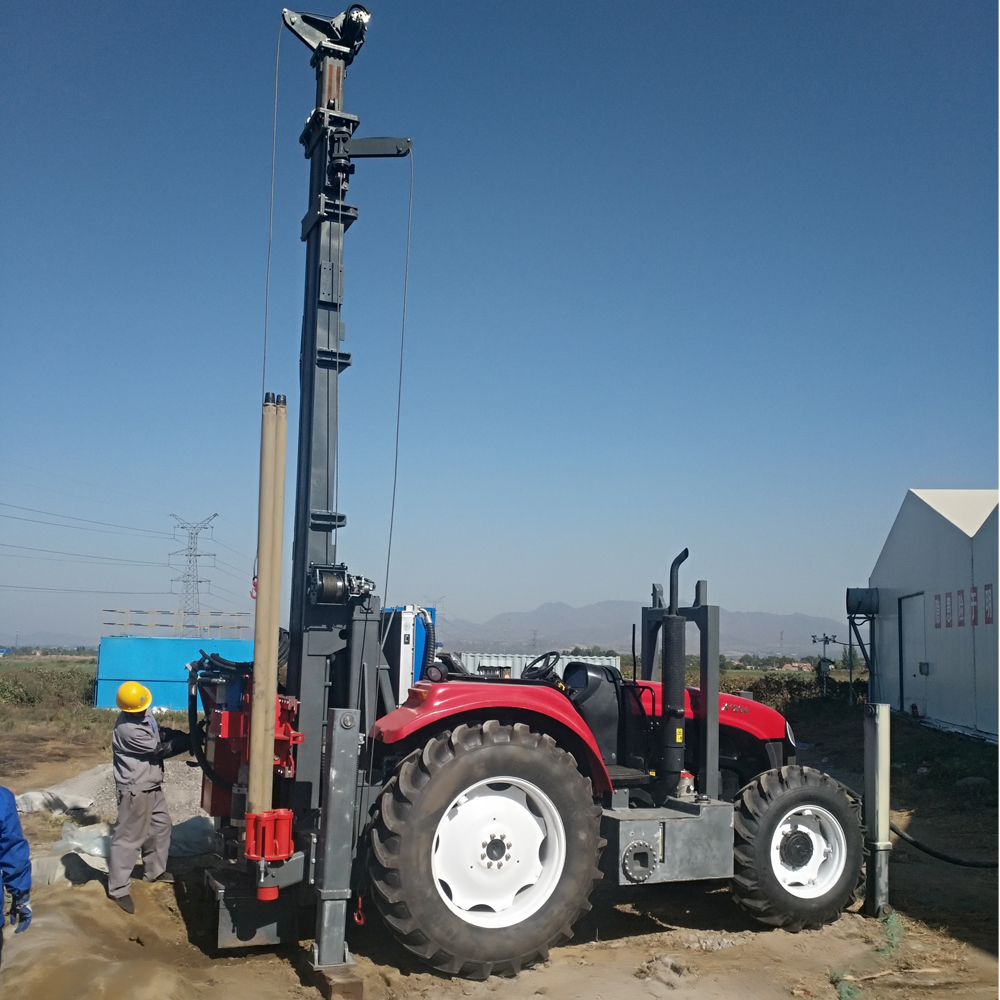 The 300 tractor series water well drilling rig adopts a full hydraulic control system. The drilling tool is driven by the power head to rotate. The design is reasonable, the structure is stable, and the maneuverability is good. It is suitable for operations under various harsh road conditions. It is widely used in drilling, geothermal energy, engineering survey, foundation treatment and other projects. It is suitable for mud drilling and air drilling, and can meet the needs of drilling in different formations. It has applied for six national patents.