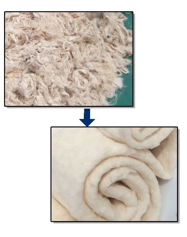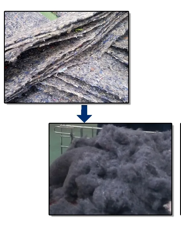 This processing line is our new textile recycling line which adopt the experience from Europe ,we extended the cylinder diameter and the working width ,meantime all cylinder are using tapered steel pins. Aluminum plate planted difference quantity tapered steel pins in specifical angle . this machine good function and higher capacity ,maximum processing capacity reach to 1500kg/hour.