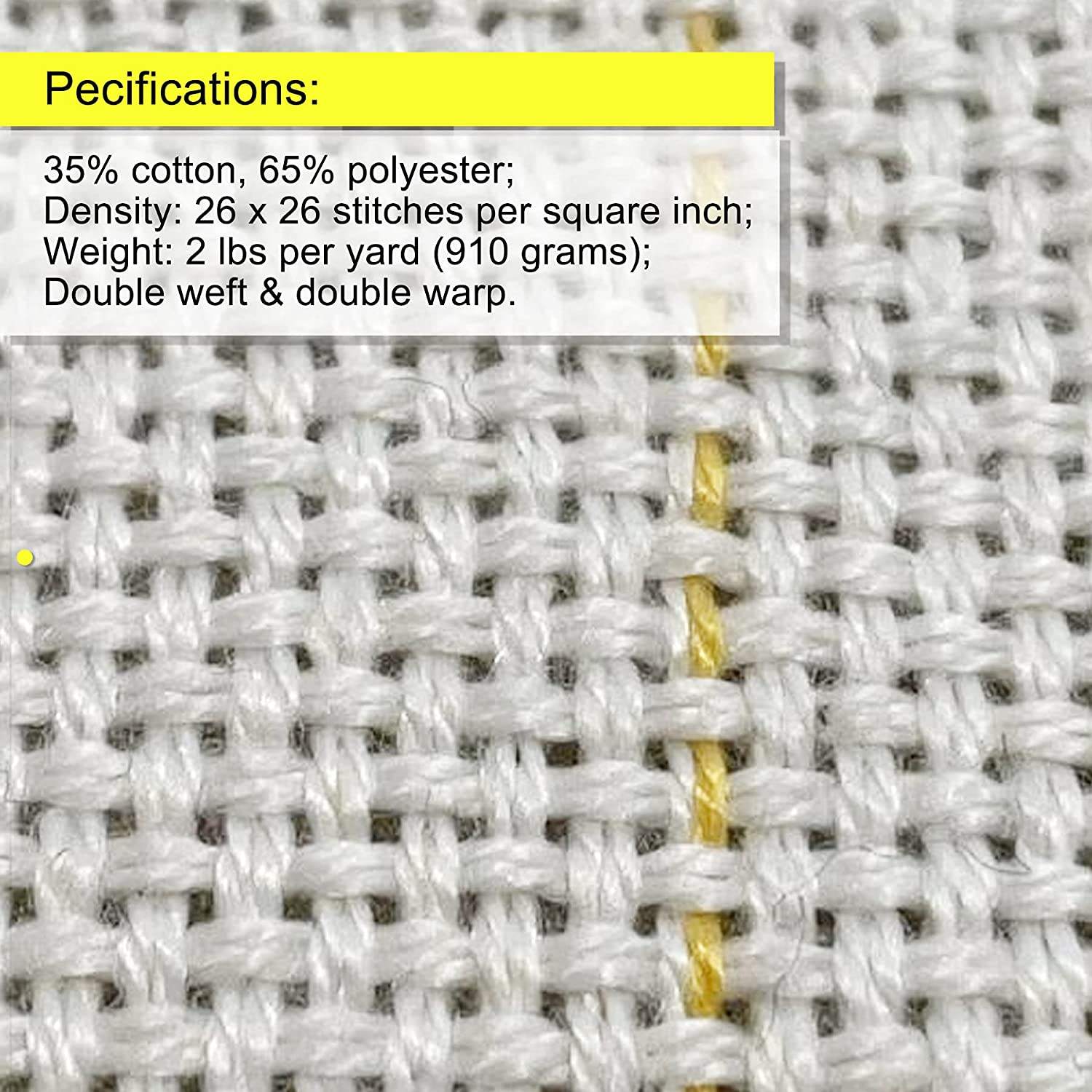 - Specifications: 35% cotton, 65% polyester; Density: 26 x 26 stitches per square inch; Weight: 2 lbs (910 g) per yard; Double weft and double warp. Compared with 100% cotton fabric, nylon is added to make the fabric more durable. If you accidentally poke the wrong thread when doing tufting, you can pull the thread out and wait until the fabric is finished before continuing.