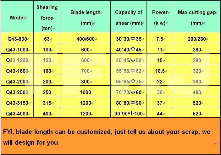 | Name | shear force(KN/T) | blade length(mm) | shearing frequency | sheared material size | power | |