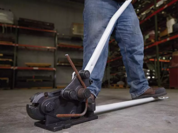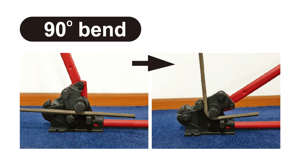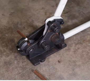 Shearing blades cut and bend rebar to 90 degrees Celsius or 180 degrees Celsius with multiple operations.