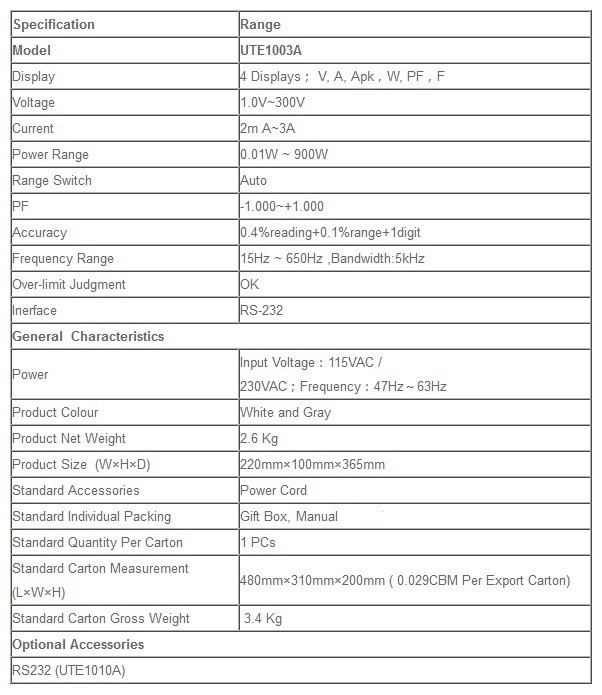 UNI-T UTE1003A Benchtop TRMS Voltage Current Digital Power Factor and Power Meter Analyzer Range 900W RS232