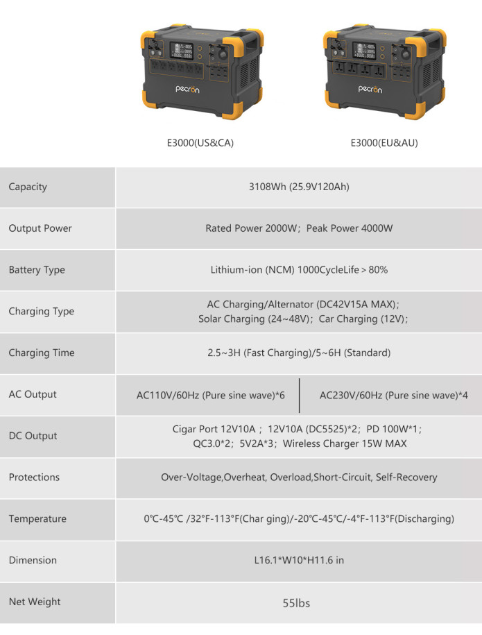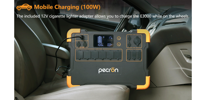 The E3000 has 16 (14 for the European version) output ports and can operate up to 16 devices at a time. Includes 6 2000W AC power outlets, 6 USB ports up to 100W, 1 cigar port, 2 DC ports and 1 15W wireless charger;