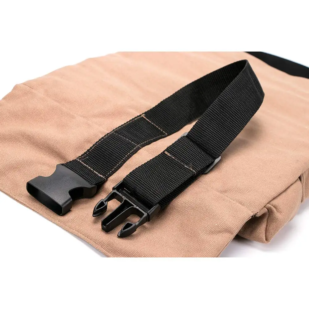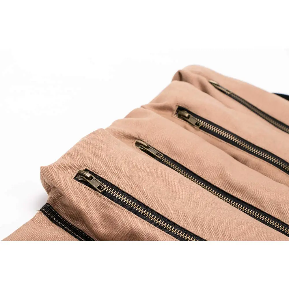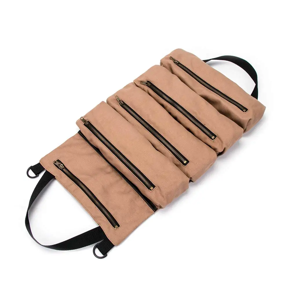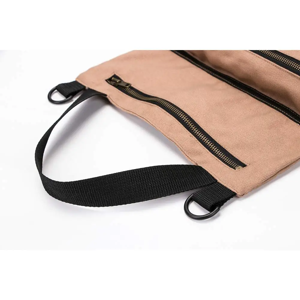 2,TOP QUALITY, STRONG & LIGHTWEIGHT:Well built with strong fixing strap in the middle, 5 zippered pockets for different types tool accesorries . Extremely durable material of waterproof waxed canvas fabric.