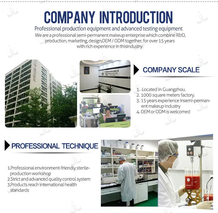 (2). Our company specializes in producing and selling high quality and reasonable price permanent makeup tattoo machine,permanent makeup pigments,anesthetic/pain killer,microblading pen,needles&blades,tattoo ink,permanent makeup accessories and training goods etc.We can satisfy all your needs on permanent makeup.