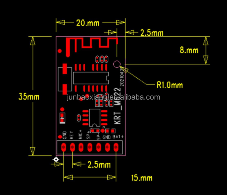 Function introduction 1. Bluetooth version: V5.1 2. Mono output 3. Support call function (optional) 4. Support button function (customization) 5. Bluetooth working distance: ≤10 meters 9. Input and output interface: a, Power input: 3.2-5V 1.5A b, speaker output interface: external 4Ω3W speaker c, button interface: up to four buttons d, Bluetooth call MIC interface e, Bluetooth indicator (blue), 10, output power: 4Ω2W 11. Signal-to-noise ratio: ≥75DB 12. Working voltage: DC: 3.2V-5V 13. Working current: ≤1A 13. Working temperature: 0℃+80℃ 14. Storage temperature: -20℃-+105℃ 15 . Product size: 20mm×35mm