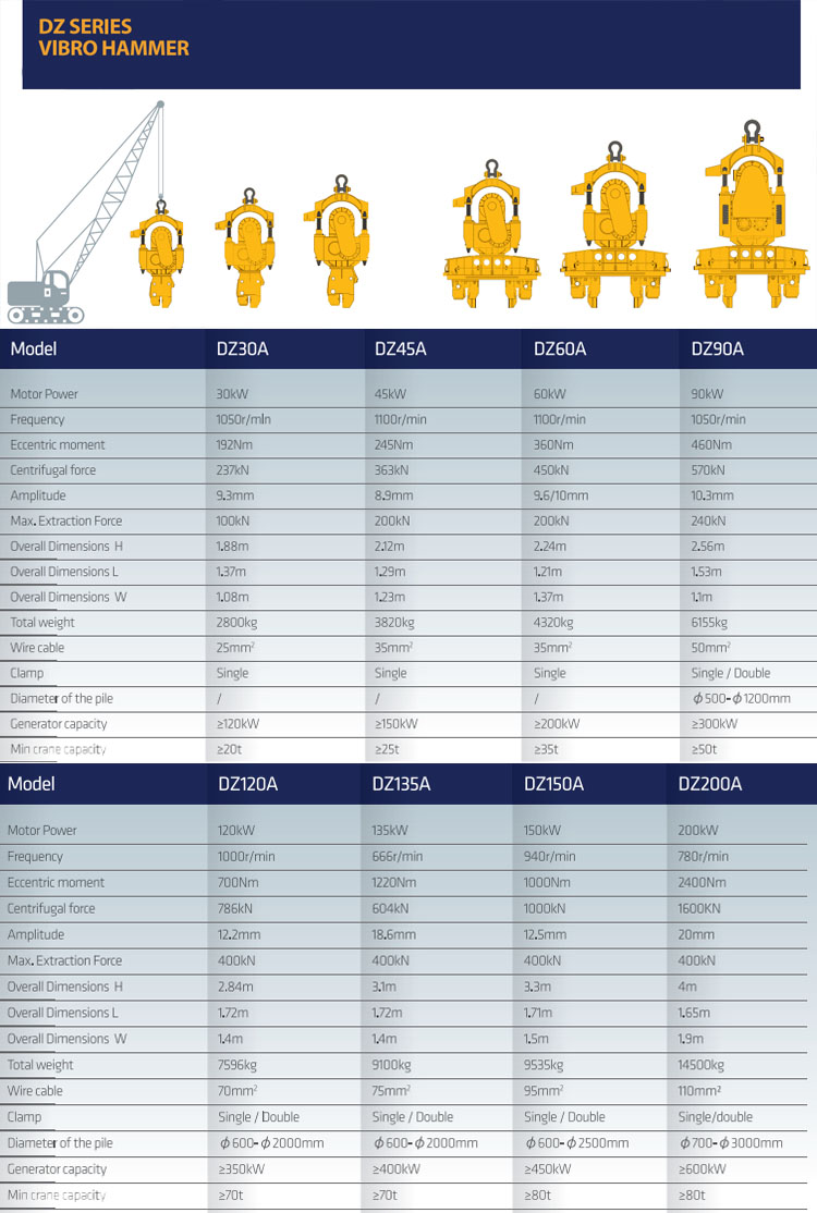 The DZ90A vibratory hammer is a popular choice for our regular customers. Various fixtures can be used to drive concrete piles, big toe piles, lime piles, gravel piles, steel pipe piles, L-shaped piles, sheet piles, etc.