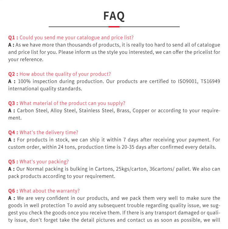manufacturing process | Raw materials, cold heading, wire rolling, heat treatment, surface treatment, full inspection. Packing and shipping |