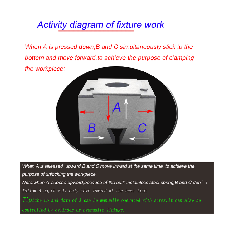 2. The clamping force is forward and downward, and the clamped workpiece will not be upturned, which improves the uniformity and precision of batch products;