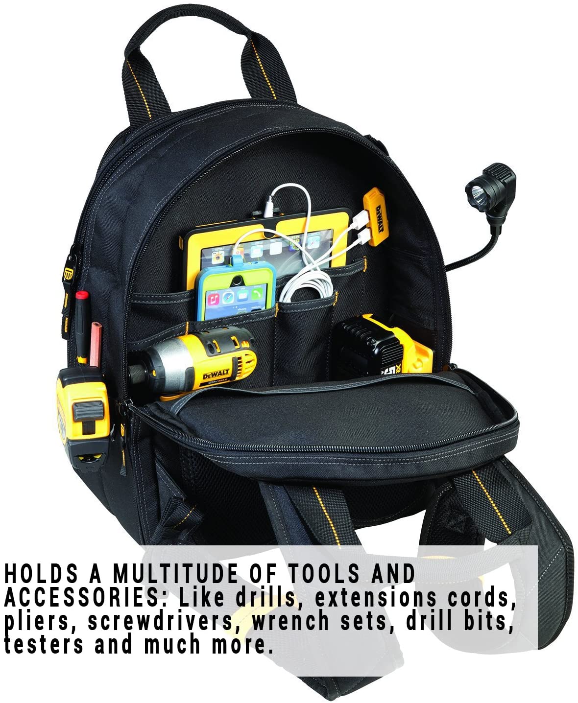 Store all your tools and accessories: This durable tool backpack holds drill bits, extension cords, pliers, screwdrivers, wrench sets, drill bits, testers and more.