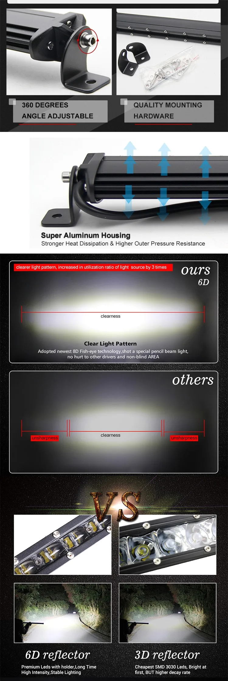 | Beam: | 10degree Spot/150degree flood/Combo; | Package Type: | Car Led Bar 4x4 20 Inch 90W 180W Driving 49 inch 32inch 120w Super Slim Single Row 6D Truck Offroad Car Led Light Bar; |