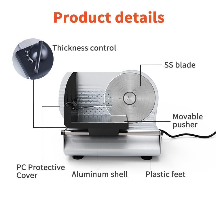 Voltage and current | 220-240V/50HZ | feature | Metal base and safety stop, cast aluminium motor base 190mm diameter. 430 stainless steel bade carriage with finger protection and End bracket slice thickness adjustable from 0-15mm Intermittent and continuous IOII switch non-slip feet |