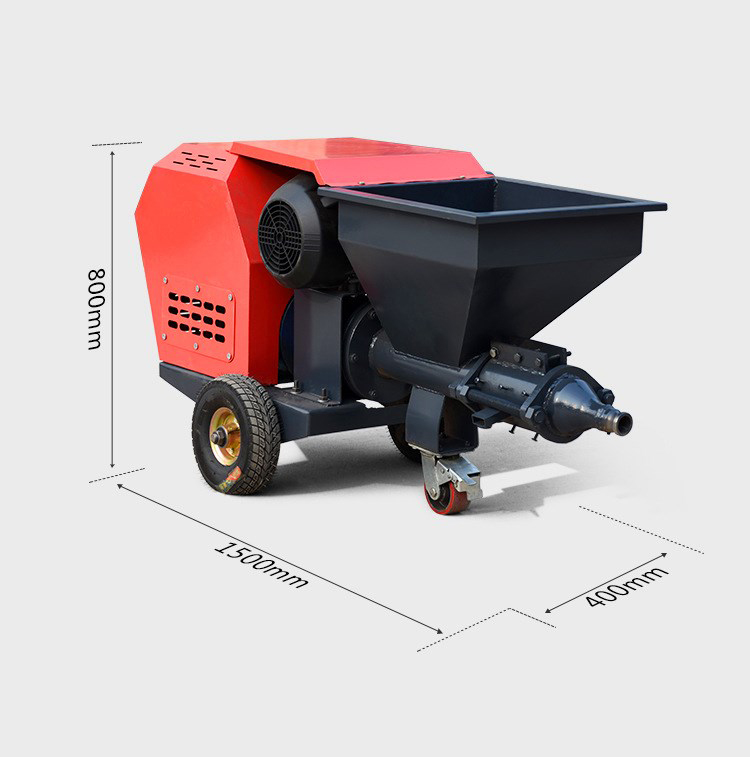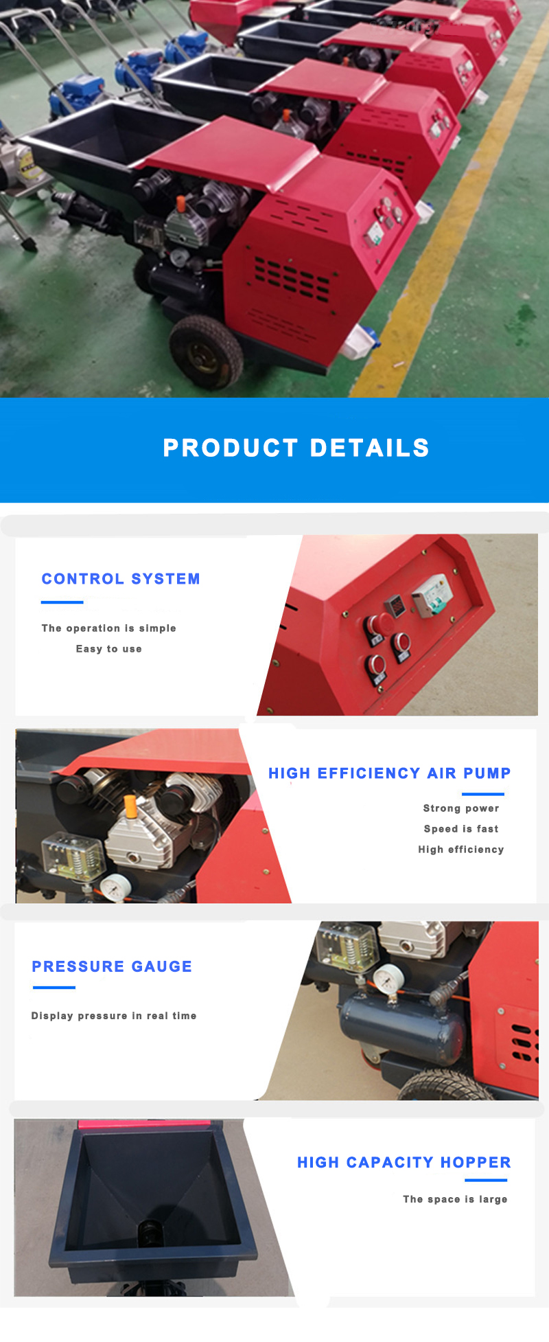 Water-soluble materials such as cement mortar, putty powder, paint, latex paint, real stone paint, thermal insulation mortar, waterproof material, refractory material, thermal insulation material, sound-absorbing material 1. Adopt all-copper Baoguo standard motor with stable performance. Reject any non-standard aluminized motor! ! 2. The connection between the spray gun and the feeding pipe can be rotated, and the operation is convenient. 3. High construction efficiency and good quality. Small size, easy to operate on site. 4. The sealant sleeve is made of black rubber, which is wear-resistant and corrosion-resistant. An umbrella has been added to the equipment. 5. It is easy to use, fast, material saving, labor saving, and money saving. Each machine only needs three people, and it can easily reach 200square meters (thickness 1.5-2cm) per hour. Working 8 hours a day, it can spray more than 1000 square meters, which is equivalent to the hard work of 20 skilled workers in one day. Shorten the construction period and create considerable profits for you.