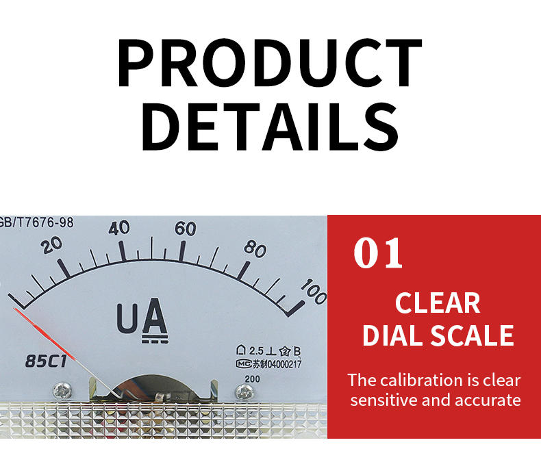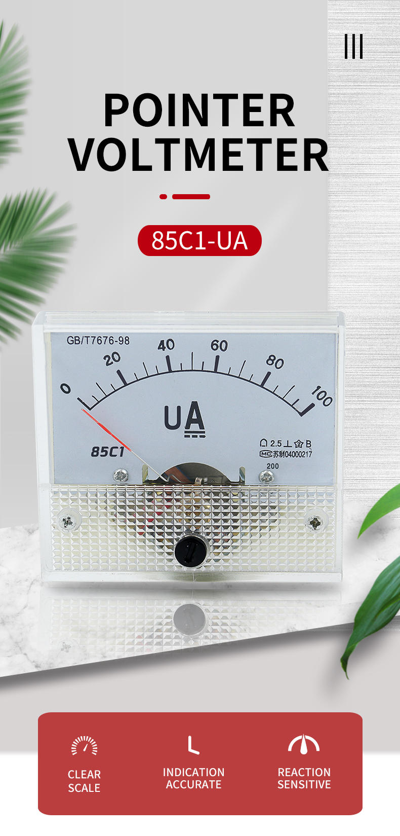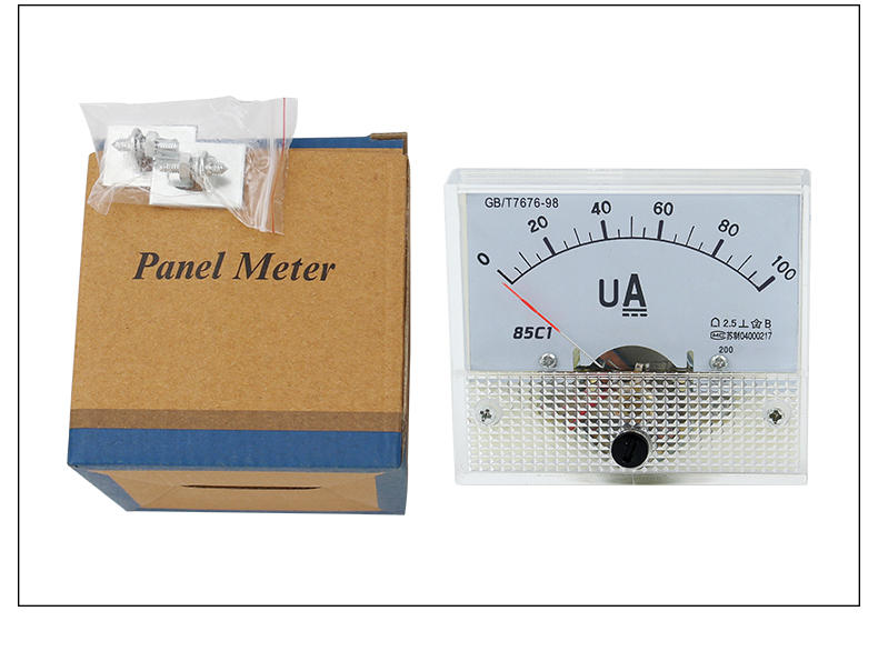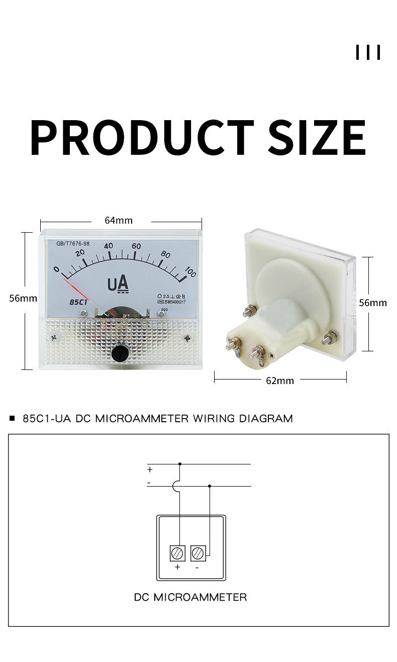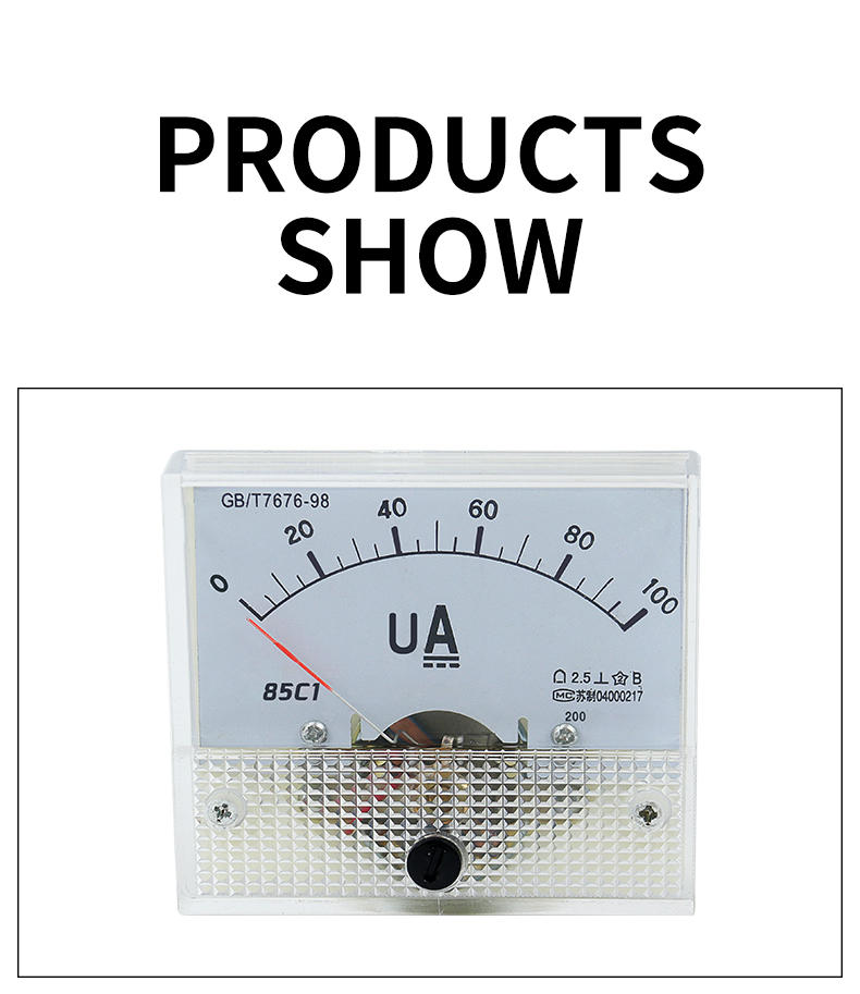 describe A DC ammeter is an instrument used to measure the strength of the current in a DC circuit. When measuring large currents, A low resistance of a certain value can be connected in parallel with both inputs to increase the range. Specification Product Name: Pointer DC Ammeter Model: 85C1-uA Size: 64*56 Accuracy class: 2.5 Response time: <4s Relative humidity: ≤85% |