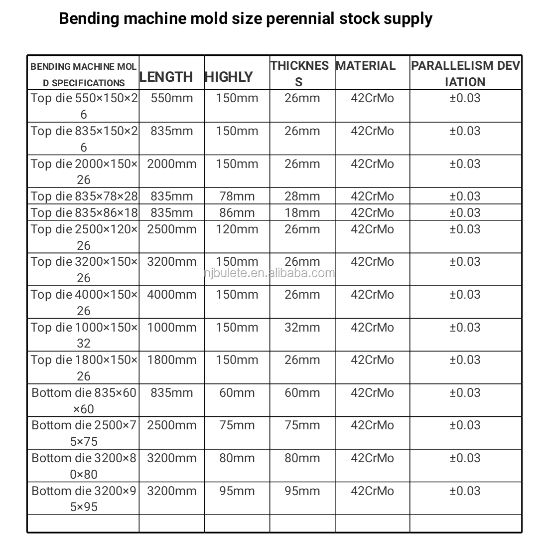 Standard length: 835mm, 800mm, 550mm (standard CNC bending machine mold products are in stock, non-standard bending machine mold specifications can be customized according to customer drawings and production requirements.)