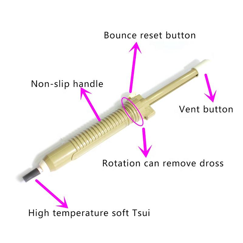 1. Press down on the plunger of the desolder to block it. 2. Heat the solder joint and melt it with a soldering iron. 3. Remove the soldering iron, quickly attach the solder mask to the tin cup, and press the button of the cup. 4. If it is not clean once, it can be repeated many times.