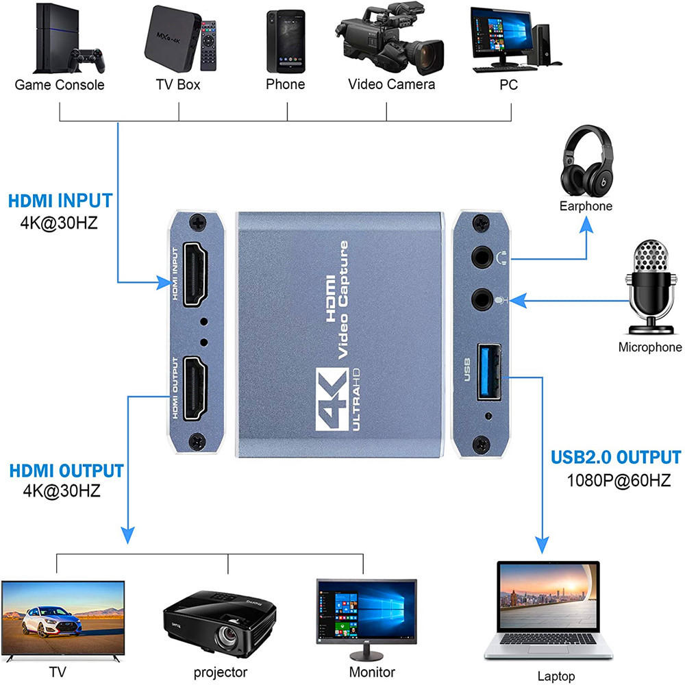 The USB3.0 video capture card is compact and portable, plug and play, no power supply, high-definition and no lag, widely used in game live broadcast, network live broadcast, teaching live broadcast, news live broadcast, conference live broadcast, etc. DIY video capture software download address OBS download address https://obsproject.com potplay download address https://potplayer.daum.net Video capture can capture HDMI video and HDMI audio, and send audio and video signals to computers and smartphones for preview and storage. It is suitable for high-definition acquisition, teaching recording, medical imaging, etc. Product introduction: This capture card can capture HDMI video and HDMI audio at the same time, and can transmit audio and video signals to computers and smartphones for preview and storage. It is suitable for high-definition acquisition, teaching video, medical imaging, etc. Features: * Support HDMI local loop out; * Support maximum input resolution up to 4K; * Support maximum output resolution up to 4k USB capture 1080p 60hz * When using standard AWG26 cable, the input transmission distance can reach 15 meters, (1080P and below resolution * Supports most acquisition software, such as VLC, OBS, Amcap, etc.; * Supports Windows, Android and MacOS; * Complies with USB Video UVC specification; * Complies with USB Audio UAC specification; * Small size, easy to carry. Specifications: HDMI Resolution: The highest input can support 4K Video Input Format: 8/10/12-bit color depth Video Output Mode: YUV, JPEG Video Output Resolution: Maximum Output Resolution 1080P Supported Audio Format: L-PCM Input Line Length : ≤ 15 meters, AWG26 HDMI standard cable Maximum working current: 0.7A/5VDC Operating temperature range: (-10 to +55℃) Connection operation: 1: Connect the UHD signal source and the HDMI input port of the USB capture card through an HDMI cable ; 2: Connect the display port of the USB capture card to the HDMI output port through the HDMI cable; 3: Connect the USB port of the computer and the USB port of the capture card through the USB cable; 4: Capture operation steps (OBS): Open the software → Add a new source → select "Video Capture Device" → set the screen size → select "Studio Mode" (dual window) → click "Start Recording", see the example below Note: Computer hardware configuration requires CPU: PC i5-3400 or above; NB i7-3537U 2.0GHZ or above Graphics card: PC NVIDIA GT630 or above; NC NVIDIA GT735M or above Storage: 4G RAM Product weight 100g