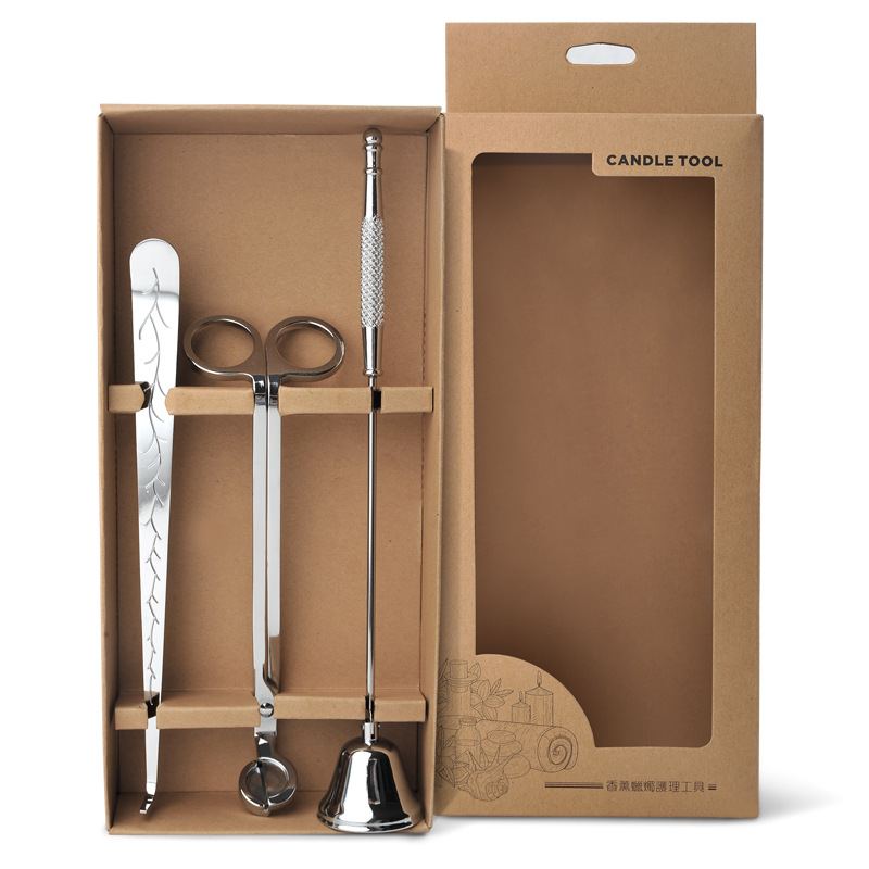 This candle accessory includes: candle wick trimmer, wick shovel, candle snuff, plate tray.