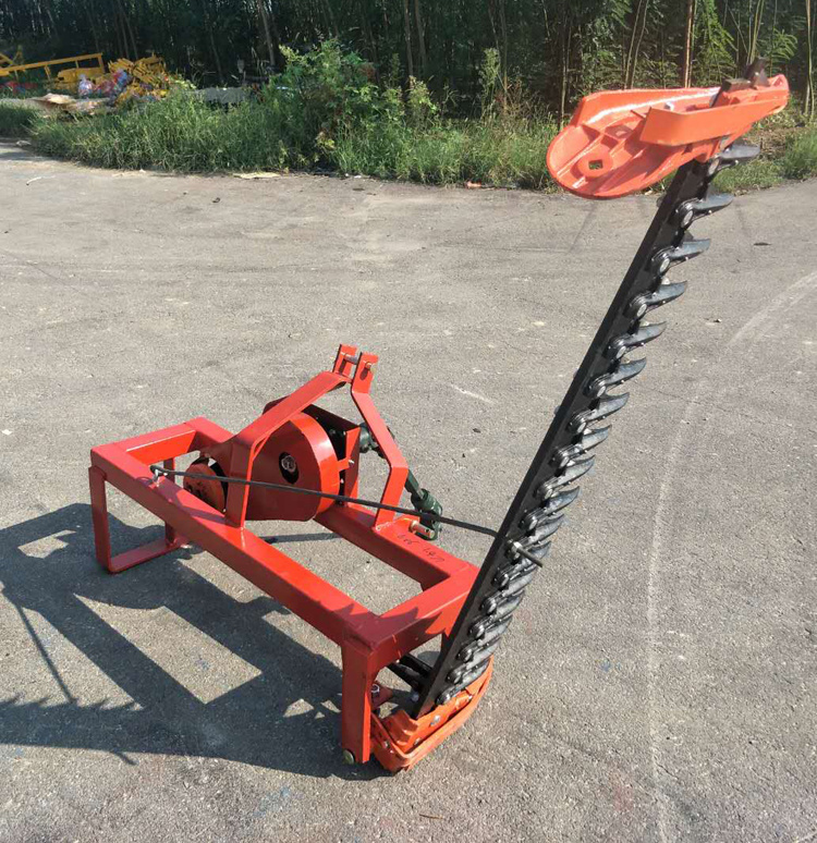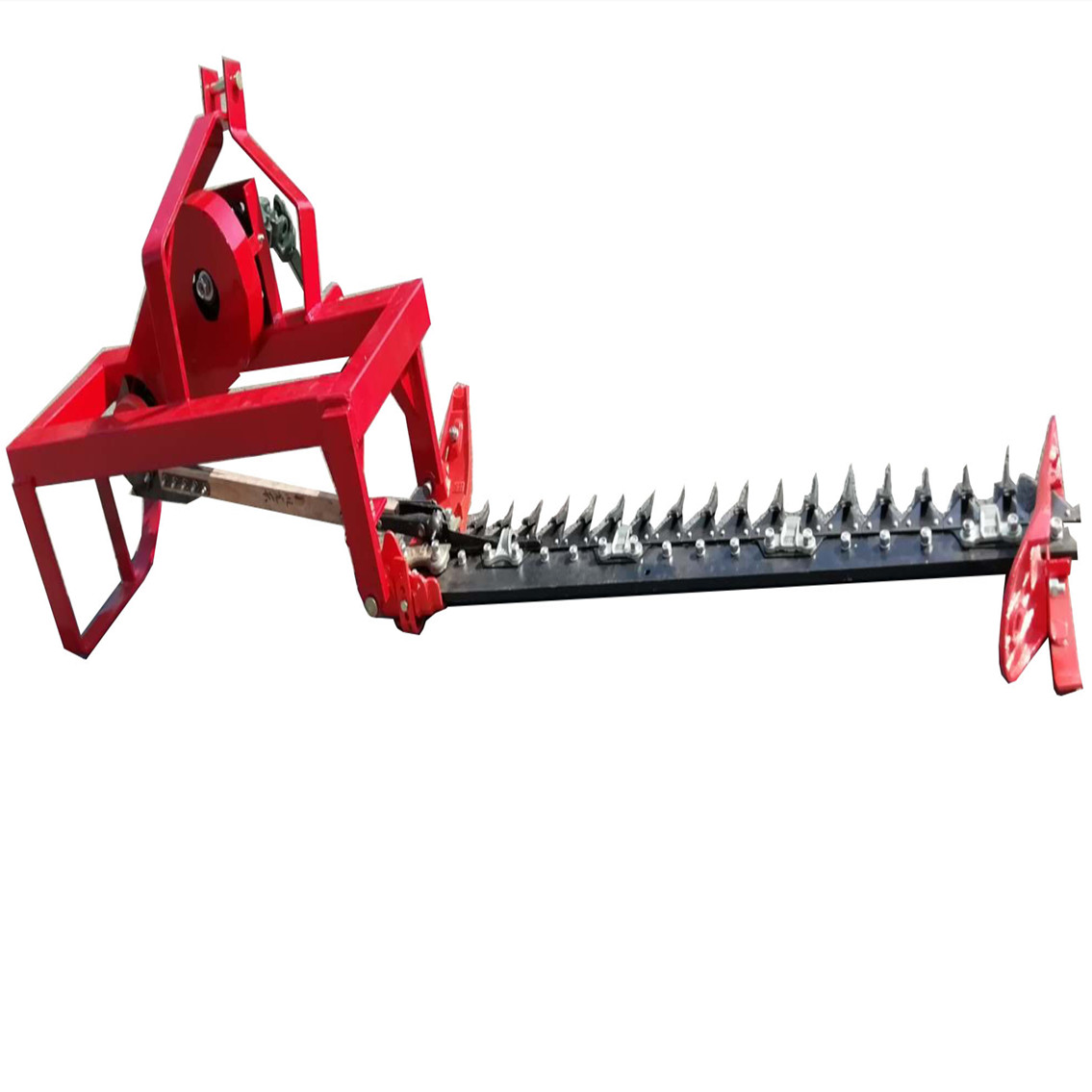 The machine adopts a bias crank connecting rod structure to drive the blades to work. It is suitable for harvesting natural forage and planting forage, alfalfa, reed, forage, etc. It uses the power output shaft of the tractor to push the blade movement of the lawn mower, adopts a three-point suspension structure to raise and lower the machine, and operates the power output structure (operating the tractor clutch) to move and stop the blade.