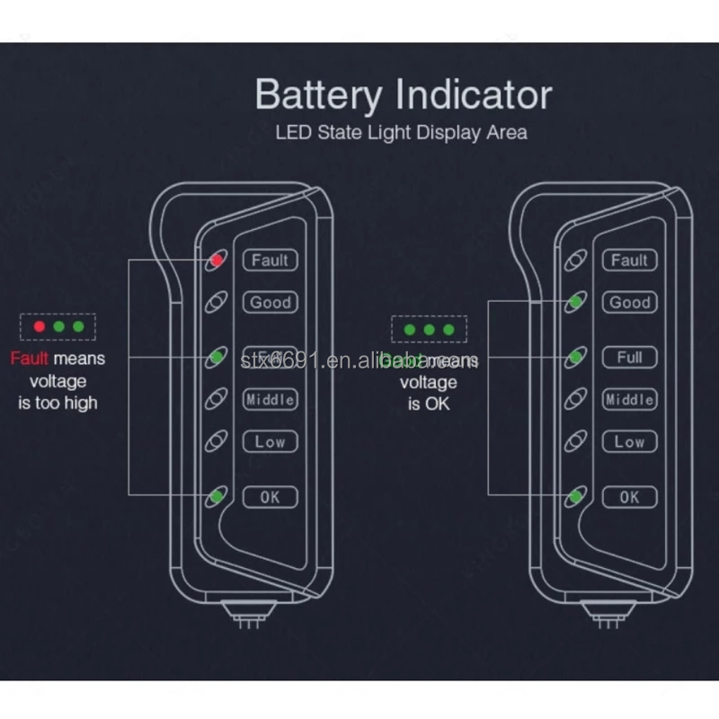 6-LED display, clearly showing alternator and battery status.
