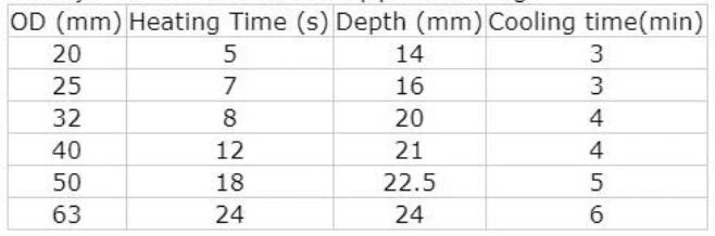 Cut the pipe. Push the pipe and fitting into the moulds for some time (See the table). Pull them out and insert the depth needed steadily .Please do not screw the pipes and fittings