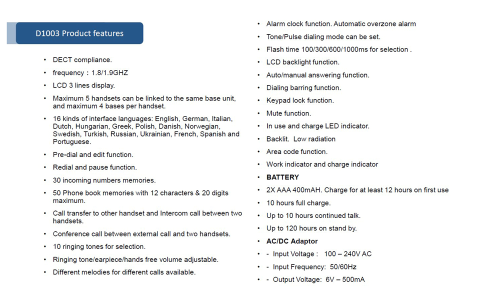• DECT compliance. • Frequency: 1.8/1.9GHZ • LCD 3-line display. • Up to 5 mobile phones can be connected to the same landline, and each mobile phone can be connected to up to 4 landlines. • 16 interface languages: English, German, Italian, Dutch, Hungarian, Greek, Polish, Danish, Norwegian, Swedish, Turkish, Russian, Ukrainian, French, Spanish and Portuguese. • Pre-dial and edit functions. • Redial and Pause functions. •30 Caller ID memory. • 50 phonebook memories, up to 12 characters and 20 digits. • Call forwarding to another cell phone and intercom call between two cell phones. • Conference calls between external phones and two cell phones. • Choose from 10 ringtones. • Adjustable ringtone/handset/handsfree volume. • Different melodies are available for different calls.