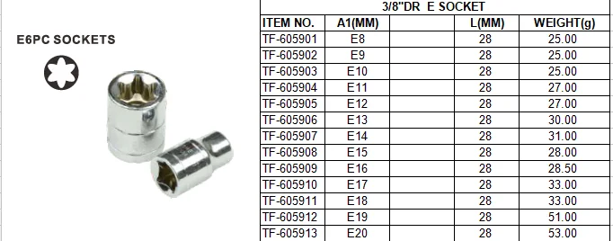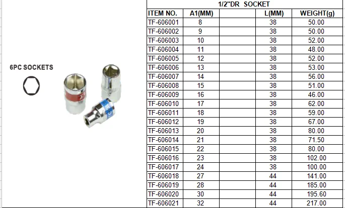 Common sockets include 6PT, 12PT, Dr socket, Deep socket, ratchet, handle, etc.