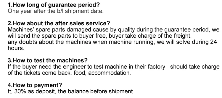 | If need our engineer go to your country to install, please repare the material and bulid machine firstly. Also buyer should take charge the tickets go and back, live, food and salary of our engineer. |