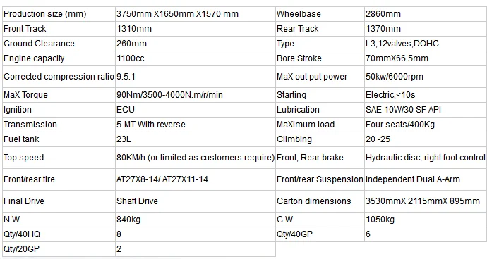 | Final Drive: | Chain Drive; | MaXimum load: | Four seats/400Kg; |