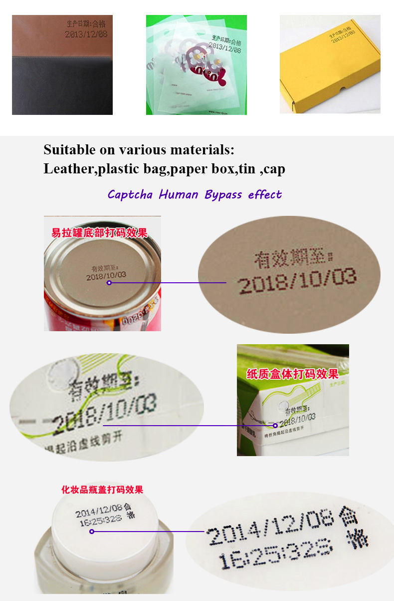 2. Through the contact printing of the font on the roller and the pure rolling surface, the date code printer prints at the same time, and automatically prints through the ink on the font on the pure roller