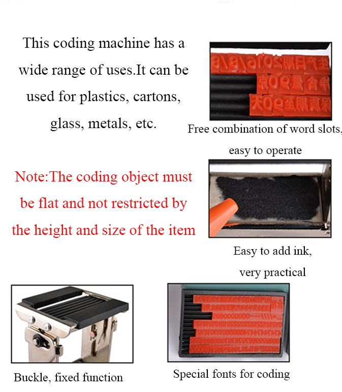 1. Carton manual rolling machine is mainly used for printing English and Arabic numerals on the surface of various paper, wood-plastic and other packaging boxes. The operation is simple and fast, and the rolling printing content is clear. Storage and transportation.